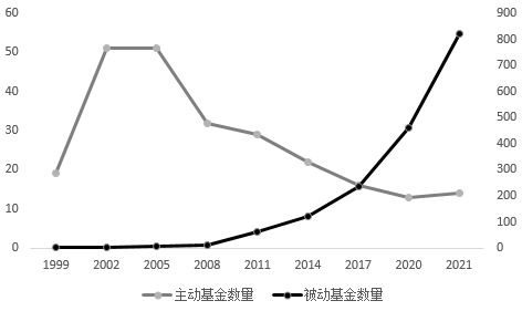 从主动基金与被动基金规模和数量来看,2000年之后,主动型股票基金的数量和规模都在不断萎缩,2008年之前公墓基金中主要以主动型股票基金为主,之后主动股票基金的市场份额迅速下滑,到2021年,公募基金基本成为被动股票基金的天下。