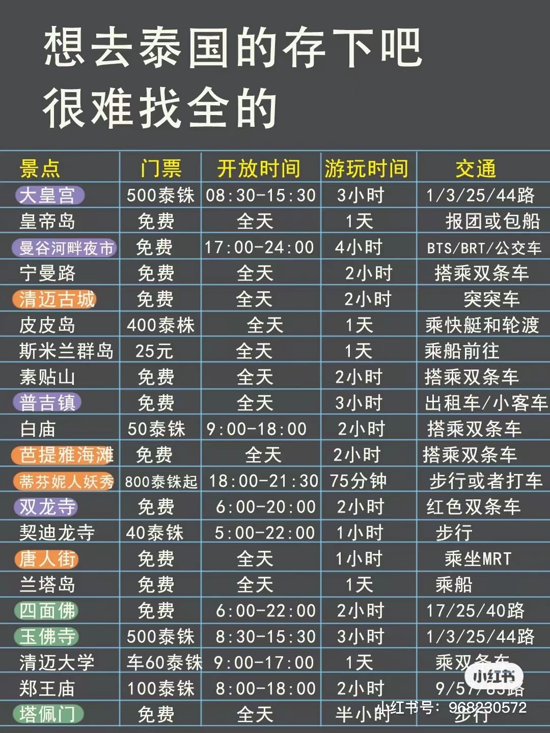 | 2023-02-13 | 玉佛寺(午饭)、大皇宫、郑王庙、湄南河看日落(可以做摩天轮)、火车头夜市(吃饭) | 800 | 大皇宫和玉佛寺门票共500铢/人(游览时间需要3个小时,不能穿无袖,露胳膊的衣服,裙子要过膝,门口的裙子大概100铢)、郑王庙100泰铢/人;坐船浏览湄南河600铢/人 |
