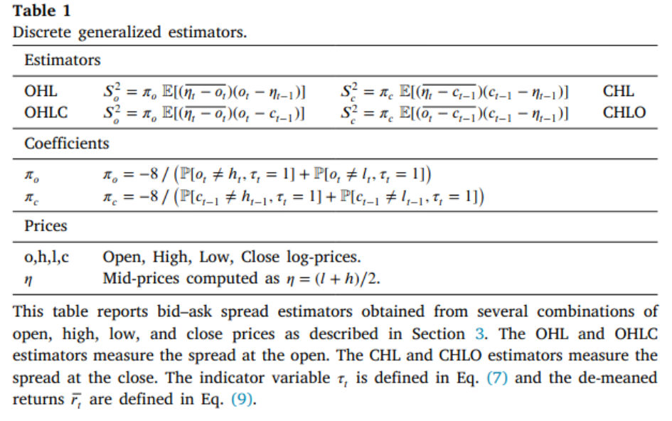 其中,\(\eta=(h_t+l_t)/2\)。但这个方法要求基本面价格服从几何布朗运动。然而,该方法没有利用开盘价、收盘价、最低价和收盘价的全部信息来估计买卖价差。