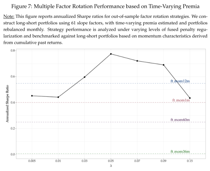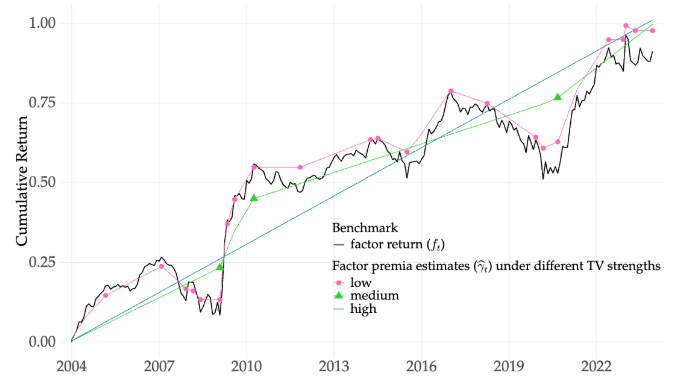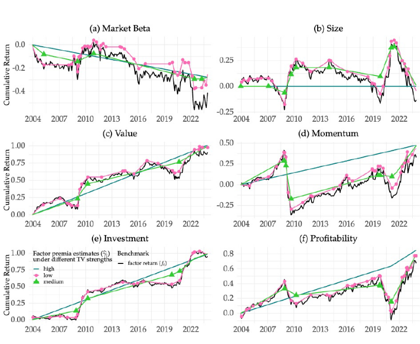我们在有和没有已知结构断裂的情况下建立了估计器的大样本属性,为基于状态的建模提供了理论支持。从经验上看,TV-PR揭示了 因素溢价的制度依赖变化,并随着时间的推移一致地确定了相关的预 测因素。基于估计风险溢价的因素择时策略优于买入并持有和因素动量基准,突出了在建模时间变化时平衡灵活性和简约性的重要性。