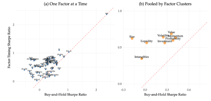 与大多数特征的买入并持有基准相比,时序策略表现出优越的性能, 如图8面板(a)中位于45度线上方的大多数点所示。图(b)将斜率因素分为八组,揭示了在因素择时策略下,规模类别内的公司实现了最高的回报。