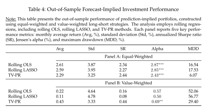 与静态模型相比,TV-PR提供了更好的解释力和更好的投资绩效, 特别是在结构变化期间。通过结合政权依赖的动态和时变的稀疏性, TV-PR解决了回报预测中的关键复杂性。这些发现有助于动态资产定价模型的文献,并为投资组合管理提供实用的见解。