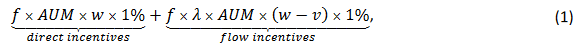 其中 f 是基金经理的费用,AUM 是基金管理的资产,w 是基金投资组合中股票的权重,λ 是流量绩效敏感度(定义为基金 AUM 的增长百分比其回报率相对于基准投资组合的 1%),v 是股票在基准投资组合中的权重。