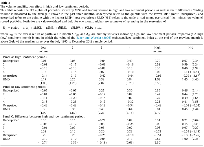 如表8所示,在投资者情绪高的时期,高估的股票获得较低的收益更加明显。