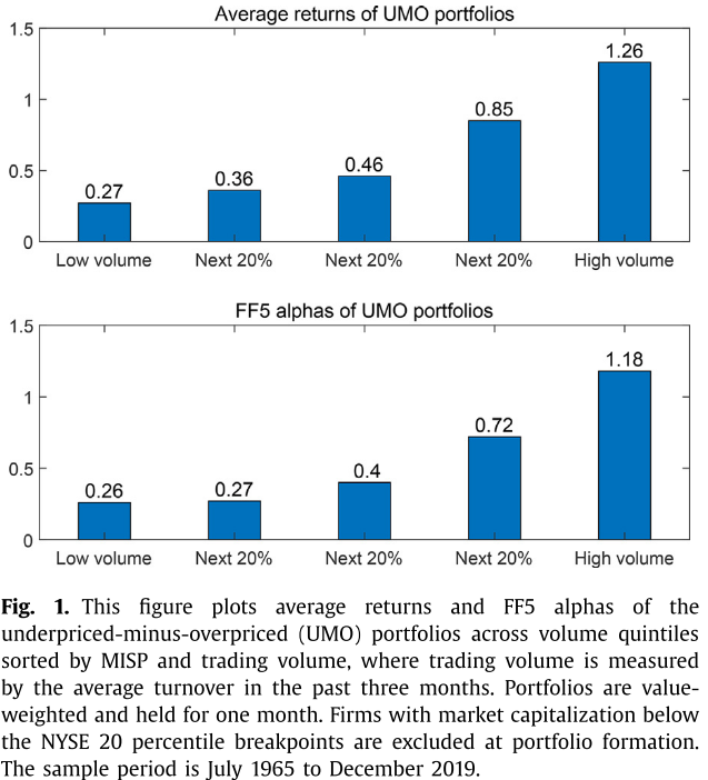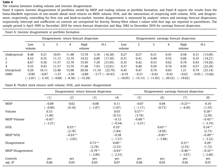本文研究发现,在高估的股票中,成交量与预期收益正相关,而在低估的股票中,成交量与预期收益正相关,表明交易量有放大错误定价的作用。采用不同的误定价和交易量度量、不同组合形成方法,并控制多个变量后,交易量放大误定价的结果仍然稳健。本研究将成交量归因于投资者意见分歧,认为投资者意见分歧预测股票收益是以预期差为条件,这与 Atmaz and Basak (2018) 最近建立的理论模型结果一致。