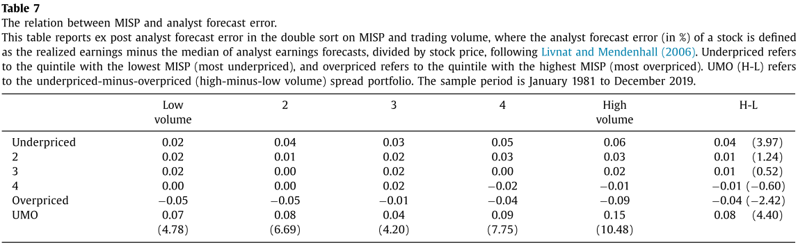Stambaugh, Yu, and Yuan (2015) 通过讨论投资者预期偏差研究了投资者意见分歧,发现投资者预期偏差与意见分歧由密切的联系。Livnat and Mendenhall (2006) 将预期偏差定义为实际盈余与分析师预测中位数差与股价之比。 在本部分,我们检验在低估股票经历负面消息后,预期偏差是否更可能由悲观投资者主导,这时事后的分析师预测偏差为正,并且交易量(投资者意见分歧)更大。相反,在高估的股票中,我们期望交易量越高,预测偏差越负。