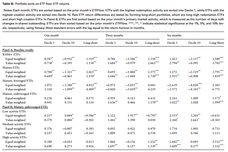 本文分四个阶段来描述ETF套利机制。在t=0时,ETF和标的资产价格相同。在t=1 时,潜在的非基本需求冲击到来,并将ETF的价格推高至基础资产净值 (NAV) 以上。这些需求冲击可能对ETF和标的资产产生不同的影响,要么是因为 ETF 受到的需求冲击大于对标的资产的冲击,要么是 ETF 对需求冲击相对更敏感。这会导致 ETF 溢价(即相对错误定价)。在t =2、套利者买入标的资产股票,卖出ETF股票,以纠正相对错误定价。他们通过在 ETF 中创建新股来结束交易,产生可观察到的ETF资金流,揭示非基本面的需求冲击。重要的是,虽然套利者通过交易来纠正相对错误定价,但他们的交易并不能纠正基本面错误定价。因此,从长远来看,随着基本面错误定价的纠正,ETF和标的资产的价格都表现出回报的可预测性。
